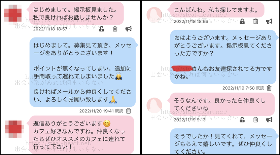 こんな感じで、「友達探し」名目で掲示板募集をすれば、警戒心を緩めてリアクションしてくれる女子多数ですよ!ヤリモク男性が多い出会い系となるので、誠実さをアピールして近づけば差別化できてスムーズに仲良くなれます(実証済み)。